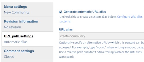 I use the Path Auto module to ensure pretty URLs, so a Title of “Create a Community” would automatically result in a URL of /create-community.